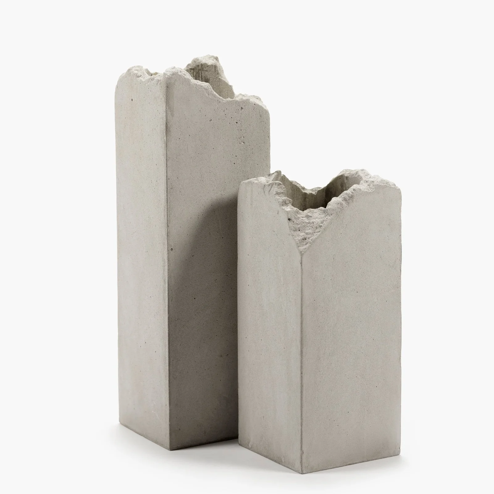 The Broquaine Vase by Patrick Paris for Serax celebrates uniqueness through handcrafted design. Made from concrete, each vase features distinct cracks created by individual hammer strikes, making every piece one-of-a-kind. The robust material contrasts beautifully with the delicate flower stems it holds, blending raw industrial aesthetics with subtle elegance. Note: the vase is not waterproof; an inner vase is recommended.